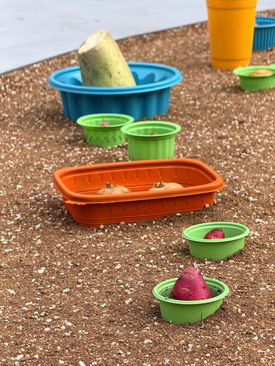바닥에는 흙이 깔린다. 그러나 이 흙은 더 이상 생명을 길러내지 않는다. 마치 도시의 콘크리트 바닥처럼, 자연과 단절된 흔적의 층으로만 존재한다. 그 위에는 형형색색으로 칠해진 플라스틱 배달 용기가 놓인다. 용기는 도시의 소비를 상징하는 무대이자, 오직 결과물만을 담아내는 그릇이다. 각 용기에는 물이 채워지고, 감자·고구마·무·당근·양파등의 채소가 반으로 잘린 채 담긴다. 채소들은 구, 원뿔, 원통, 혹은 단순하게 절제된 단면으로 존재한다. 본래의 불규칙성과 흙과의 관계가 지워진 이 형태들은 ‘과정이 절단된 결과’의 아이러니한 표상이다. 그러나 전시는 정지된 상태로 머물지 않는다. 시간이 흐르면서 채소들은 변색되고, 썩고, 때로는 물 위에서 잎을 틔운다. 며칠 사이에도 관객은 형태가 달라지고 냄새가 바뀌는 장면을 마주하며, 잘려나간 결과물 속에서도 다시금 과정의 시간이 솟아나는 경험을 하게 된다.