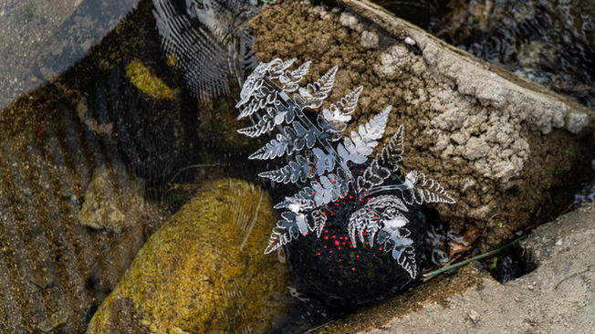 This artwork shows the moment when people, like small islands, meet at the water’s edge of the old village laundry site and gently drop anchors toward each other. The connected floating islands and the clear, blooming brackens on top of them create a picture of a moving community—one where people reflect each other, lean on each other, and stay together.